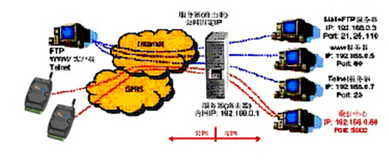 企业已有稳定的、永久的连接到Internet 的接入;企业端的路由器端口地址,监控中心IP地址应是公有的,且由为企业提供Internet 连接的ISP 提供, 此种方案客户须先向INTERNET运营商申请公网固定IP。中心用公网固定IP,监控点直接向中心发起连接。或客户公司有一台连接Internet的服务器,并且具有公网固定IP,但是考虑到服务器的稳定运行问题,通常不让在服务器上安装其他应用软件,所以GPRS数据中心系统也不能安装在该服务器上,可以用NAT端口映射的方法来解决这个问题。